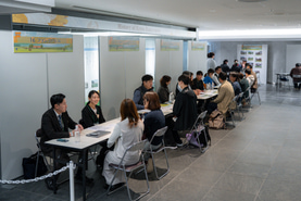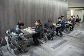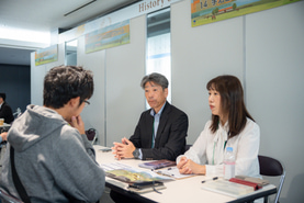 「就業相談エリア」には、関西の育成牧場に加え、北海道に拠点を持つ総合牧場や生産牧場など計18牧場(前年18牧場)が参加し、担当者がパンフレットやPCを活用し、仕事内容やインターンシップ等について視覚的にわかりやすい説明を交えながら個別面談を実施しました。相談者が重なった際には、複数の相談者への対応が可能となるよう交流エリアを開放するなど、事務局でも柔軟かつ円滑な運営に努めました。