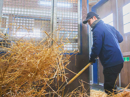 基本的に1日の仕事は午前が6時30分から10時30分、午後は0時30分から4時30分までとなっています。午前は、夜間放牧馬の集牧・日中放牧馬の放牧、馬房掃除と集牧した馬の手入れをスタッフで手分けして行います。午後は、夜間放牧馬の放牧・日中放牧馬の集牧、馬房掃除・手入れを行います。他に飼い葉作りや、治療・削蹄作業の対応が入る日もあります。あとは朝飼い・夜飼いの当番があり、シフトで1~2週間に1回、勤務時間外に飼い葉付けと、馬に怪我などがないかをチェックします。春先から夏にかけて忙しくなってくると多少の時間の前後が出てきます。4月頃から7月にかけて、クラブ募集馬の撮影やツアー対応、セリ上場馬のお客様対応などでとても忙しくなります。休みは日数が決まっていて、厩舎内のスタッフで偏らないように取っていくのですが、自分の好きなタイミングで取れることがほとんどなので、ストレスを感じる事がなく、良いなと思っています。