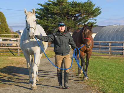 中学生の時にある程度進路を決めようと思い、動物関係の仕事に就ければいいなと考えていたのですが、親に競馬場に連れて行ってもらった事がきっかけで馬の仕事に興味を持ちました。ゲームを通じて競馬の知識は少し持っていたのですが、知っている血統の馬が実際に走っていたり、ちょうどキタサンブラックのような強い馬も活躍していて、自分も強い馬を育てたい、馬に乗ってみたいと思い、高校卒業の資格も取れる馬の専門学校・アニマル・ベジテイション・カレッジに進学しました。馬の基本的な扱いや、乗馬レッスン(馬場馬術・障害馬術)を受けるなど3年間みっちり学びました。3年間で1000~1500鞍くらいは乗りました。