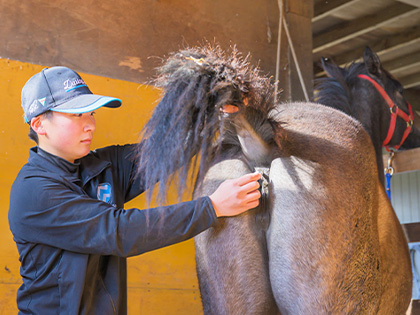 馬をしっかり観察する事です。ある程度の基本はあるのですが、馬の個性に合わせて作業することが大事で、手入れするにしても強さやブラッシングの仕方を変えたりしています。馬が今どんな気持ちか、何に意識を向けているのかを観察して行動しないと、お互いの怪我にもつながるので注意しています。